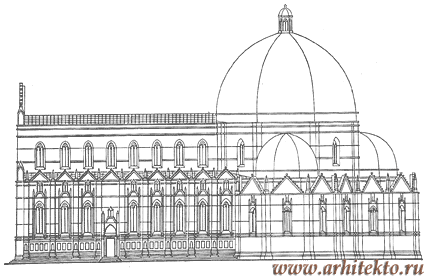 Слева: Общий вид флорентийского собора по проекту Арнольфо ди Камбио(1295-1302 гг.).